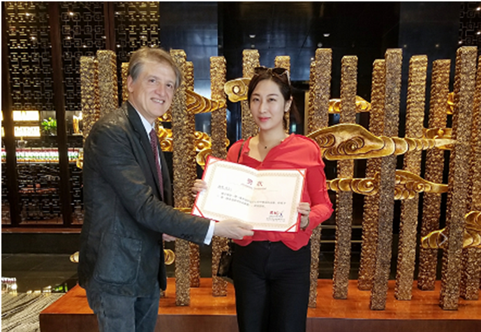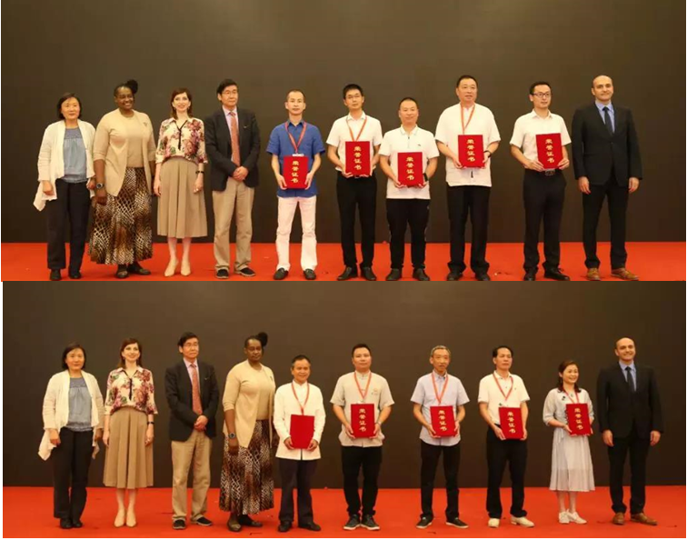 当日上午,丝绸之路城市联盟跟福鼎市委市政府双方的代表,还邀请了一带一路沿线的外交官们共同向参与公益项目的福建品品香茶业有限公司,福建省天湖茶业有限公司,六妙白茶股份有限公司,福建誉达茶业有限公司,福建鼎白茶业有限公司,福建省大沁茶业有限公司,福建永香茶业有限公司,福鼎市原香茶业有限公司,福鼎市品茗香茶业有限公司,福建省裕荣香茶业有限公司等10家企业,一一颁发了“一带一路公益茶项目贡献企业奖”证书。会后,意大利总理府参事饶塞佩向故宫博物院创意设计顾问钟华女士也颁发了证书。
