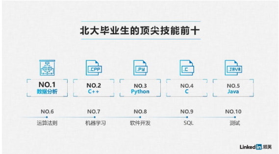 从行业维度上看,在北大毕业生高频选择的前十家公司榜单中,高科技公司占据了“半壁江山”。谈到毕业生的技能和素质,领英数据显示北大毕业生的顶尖技术类技能位列前五的依次为:数据分析、C++、Python、C、Java。这不仅多维度印证了当前行业市场对具备相关数字技能的高科技人才求贤若渴,同时也体现出北大作为国内“双一流”高校的代表者之一,在课程设置方面已捕捉到科技专业与数字技能的“走红”趋势。