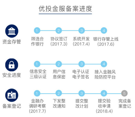 2018年4月25日,优投金服如期向广州市天河区商务和金融工作局提交了合规备案验收申请及材料,平台合规备案工作取得了阶段性进展。