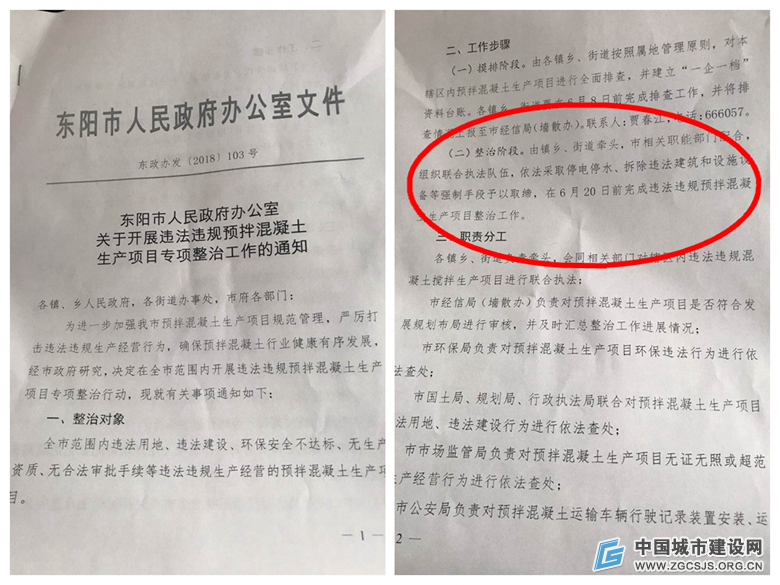 5月23日,我社刊发调查报道《浙江东阳:吸取教训 整治取缔违法搅拌站刻不容缓》一文,披露浙江省东阳市存在违法、违规的预拌混凝土搅拌站现象。文章刊发后当地政府曾专门发文《东阳市人民政府办文件—东政办发【2018】103号》表示:由镇乡、街道牵头,市相关职能部门配合,组织联合执法队伍,依法采取停电停水,拆除违法建筑和设施设备等强制手段予以取缔,在6月20日前完成违法违规预拌混凝土生产项目整治工作。