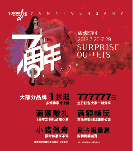 暑期来临,气温升高,热情不减,恰逢北京斯普瑞斯奥莱7周年生日季,在炎热的夏天为大家带来惊爆的活动,7.20-7.29连续十天的店庆活动,六大看点,燃爆这个盛夏!