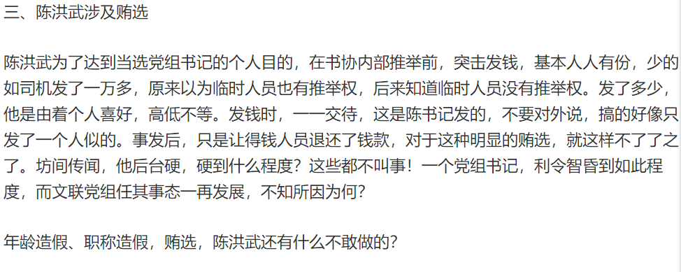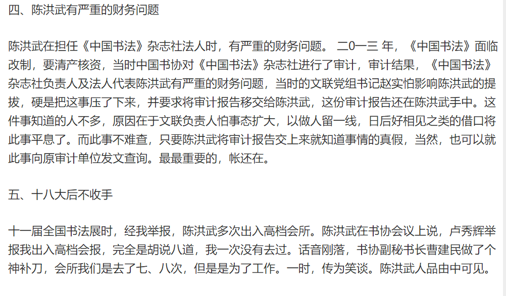 今日,书法圈的一则爆炸性帖子引发广大书友热议,该帖子题为“中国书法家协会为什么不作为?--党组书记陈洪武作为了什么?”作者名为卢秀辉。文中曝出中国书法家协会党组书记陈洪武年龄造假、职称造假、贿选及曾经还有严重的财务问题等,并指出陈洪武在工作上搞阳奉阴违是个两面人。
