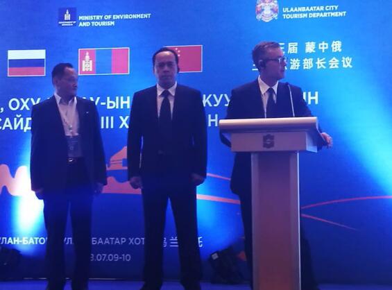 曹勇(中)在第三届蒙中俄三国旅游部长会议上。