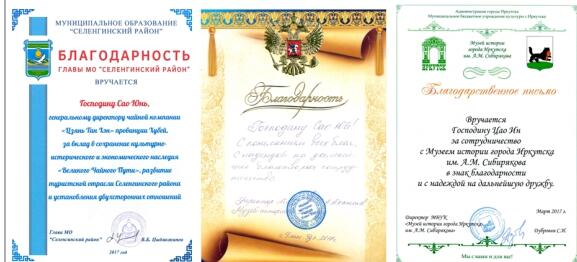 伊尔库茨克市政府、色楞格大区区政府及乌兰乌德市博物馆馆长给曹勇先生的感谢信和收藏证书。