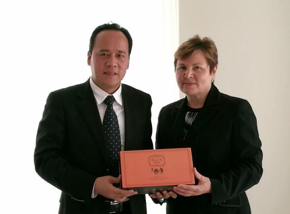 曹勇先生向俄罗斯联邦多戈布鲁尼市第一市长娅莉桑德拉赠送茶砖。