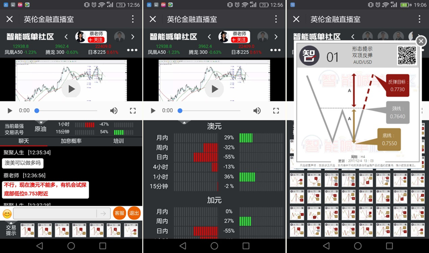英伦金融直播室特别加入“交易讯号”栏目:智能化机器人通过大数据分析,汇总焦点产品的市场情绪,投资者(特别是新手)点开栏目即可确认所需产品在不同时间周期的风向,绿色表示看多,红色表示看空,百分比表示看多看空的激烈程度。配合“形态提示”栏目中具经验的分析师结合自能规则筛选出盈利最佳的一系列策略,自己也能轻松做单!