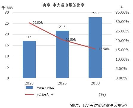 根据越南政府的VII号电力规划,电力行业优先推展水力发电项目,尤其是综合水利项目(防洪、供水、生产电力);试验研究蓄能水电厂的运行以提高电力系统的运行效率。各家水电厂(包括中小型水电厂和蓄能水电厂)的总功率从目前的1.7 万MW涨至2020年的2.16万 MW,至2025年涨至2.46万 MW(其中蓄能水电为1200 MW), 2030年涨至2.78万 MW(蓄能水电2400 MW)。蓄能水力发电量至2020年、2025年和2030年分别占全国发电总量的29.5%、20.5%和15.5%。