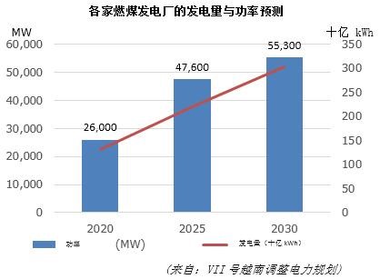 截至2020年,各家燃煤发电厂的总功率为2.6万 MW,发电量约为1310亿kWh,占全国发电总量的49.3%。2025年,各家燃煤发电工厂的总功率约为4.76万MW,发电量约为2200亿kWh,占全国发电总量的55%。2030年,燃煤发电工厂的总功率为5.53万MW,发电量约为3040亿kWh,占全国发电总量的53.2%。