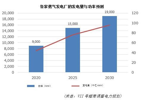 至 2020 年, 各家燃气发电厂的总功率约为9000 MW,发电总量为440 亿kWh,占全国发电总量的16.6%;2025 年 ,各家燃气发电厂的总功率约为1.5万 MW,发电总量约为760亿 kWh,占全国发电总量的19%;2030 年,各家燃气发电厂的总功率约为1.9万MW,发电总量为960亿kWh,占全国发电总量的16,8%。