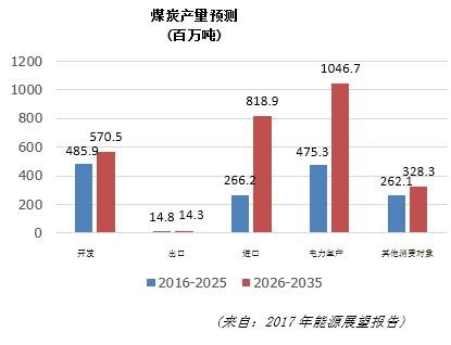 据工商部的预测,在2016-2025年间,煤炭开发和进口总量分别达 4.859亿吨和2.787亿吨,用于其他消费对象的煤炭总量为 2.621亿吨。在2016-2035 年间煤炭开发和进口总量分别为10.564亿吨和10.851亿吨。