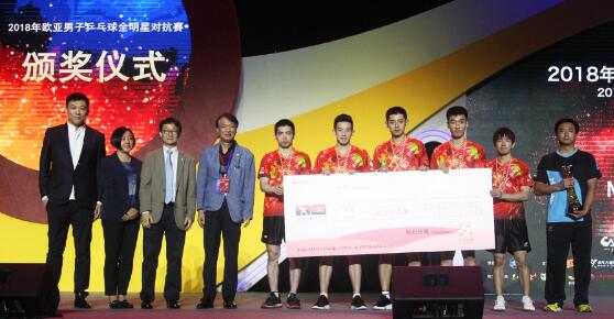 2018亚欧男子乒乓球全明星对抗赛,8月5日在江苏南通圆满落幕。经过两天的奋战,由国球名将张继科领衔的亚洲战队最终以总比分7比3的的绝对优势战胜欧洲队,颁奖仪式上亚洲队代表捧起了由亚洲乒乓球联盟秘书长余国梁先生颁授的2018亚欧男子乒乓球全明星对抗赛的冠军奖杯及国家体育总局乒羽中心副主任、中国乒乓球协会副主席柳屹女士为每位队员挂上了本次赛事精心打造的和田玉冠军奖牌,闭幕式现场,北京钛石文化传媒有限公司董事长李乔先生分别向亚欧两队颁发了此次亚欧赛事共高达10万欧元的赛事奖金,同时向张继科授予此届亚欧对抗赛最佳MVP球员奖牌。