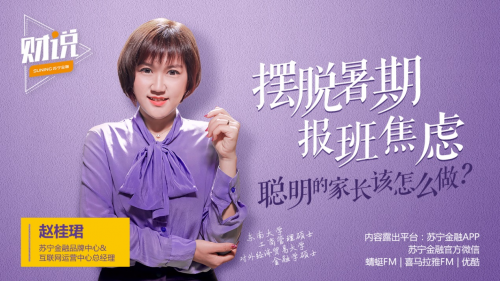 暑假已经过去了大半,你家的孩子补课了吗?原本被无数上班族艳羡的暑假,已经被疯狂的暑期补习班生生地弄成了“第三学期”。孩子们不高兴,家长们也很无奈。苏宁金融有声读物《财说》第三期节目《摆脱暑期报班焦虑 聪明的家长该怎么做?》邀请到了两位时尚辣妈,苏宁金融品牌中心暨互联网运营中心总经理赵桂珺,以及《财说》的热心听众Jessie,作为家长代表,她们一起跟大家聊聊暑期报班补课那些事儿。