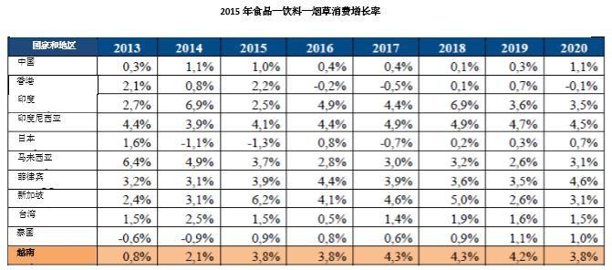 预期至2020年,越南将成为亚洲地区第三大拥有较高食品饮料消费增长率的国家。在2018-2020年阶段,食品饮料消费额有望继续高增至3.8-4.3%。如此可见,越南食品饮料工业的前景较为乐观,能够在未来时间吸引大量外国投资资金。