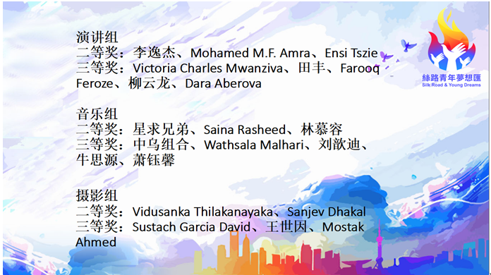 本次赛事分别为演讲组和音乐组设置了一等奖2名,二等奖3名,三等奖5名;为摄影组设置了一等奖1名,二等奖2名,三等奖3名。经过历时两天的激烈角逐,本届次“丝路青年梦想汇”的演讲、音乐、摄影三项比赛,从百余名选手中脱颖出冠亚季军共26名,分别来自12个国家,为丝路沿线的年轻人提供了充分的展示平台,让选手们在各自的舞台上展现才华,追逐梦想,释放青春的力量。夺取最终桂冠的分别如下:演讲组冠军—中国选手农钦、巴基斯坦选手Sajida Riffat Laraib;音乐组冠军—津巴布韦选手Garry Garikai Munashe Mapanzure、中国选手李洋;摄影组冠军—孟加拉选手Al-Amin Chowdhury Jason。
