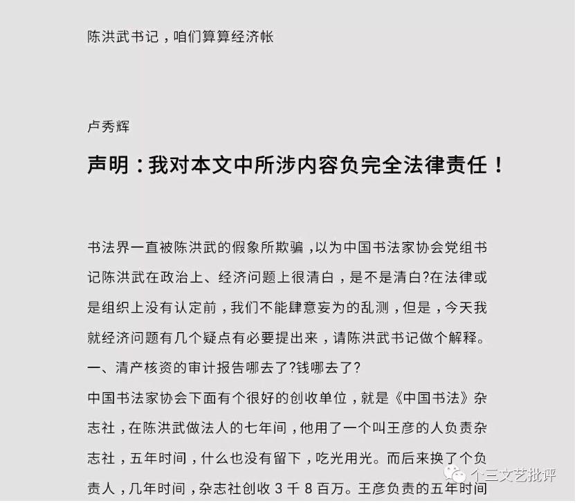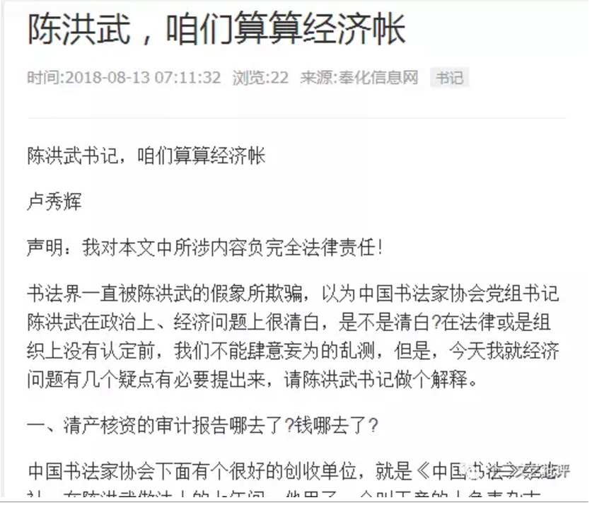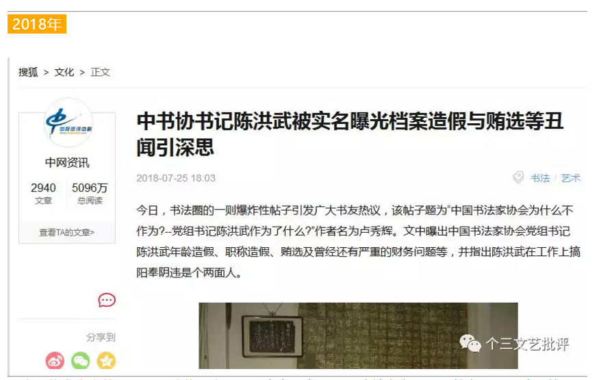 ▲在网络发布多篇举报陈洪武的文章,如《中书协书记陈洪武被实名曝光,档案造假与贿选等丑闻引深思》(截图)