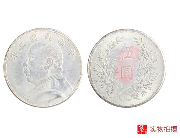 此枚“民国三年伍圆银币”,正面为袁世凯戎装侧面头像,上书中华民国三年,背面饰嘉禾纹饰与“伍圆”币值。“年”字后没有“造”字,其他年版都在“年”字后面有一“造”字。三年版“民”字中有一“点”,而其他年版民字无“点”。民国三年袁大头伍元铸量少,工艺精,是钱币收藏的热门,价值高昂!