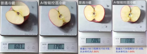 在智能控湿舱保存的果蔬,放入前相比,重量只是略微发生了变化,普通冰箱冷藏室保鲜下的的果蔬失水率远远大于智能控湿舱保鲜的果蔬失水率。