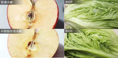 而从果蔬的外观上可直接看出,同样的存储时间,智能控湿舱下的食材并未干瘪现象,果肉氧化轻微,去掉保鲜膜的绿色蔬菜也能在智能控湿舱下,几乎保持了原有的新鲜状态。