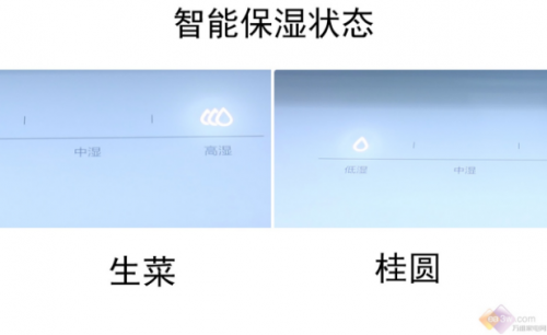根据食材放入的放入,冰箱自动智能识别,调整湿度状态,对于湿度要求高的生菜,自动匹配为高湿;而对于干货桂圆,则自动归为低湿档。
