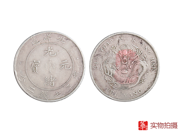 广州华逸展示的此枚光绪元宝“北洋造”钱币,直径:3.86cm。钱面:珠圈内满汉文“光绪元宝”,圈外上环“北洋造",下环“库平七钱二分”,左右各一圆点心。钱背:中心为蟠龙图,上下环英文,左侧有阿拉伯数字“34”,左右各一圆点心。