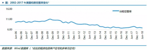 美国人口普查局(Census Bureau)报告称,2016年美国租房空置率自2009年以来首次上升,从历史低点2016年6月的6.7%升至2017年9月的7.5%。随后租房空置率又有所波动,2018年保持在7%左右。