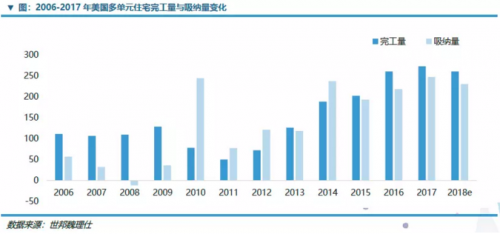 因为租赁需求的激增,多单元住宅的建设量在经历了历史低谷后迅速增加,而完工数量经历了2010~2013年的低谷后开始持续稳定增长。2018年全美在建房屋超过62.5万套,不过由于建筑工人的劳动力短缺和材料成本的上升,许多项目需要更长的时间才能完成。因此,市场预估2018年的交付数量可能达不到过去两年的水平。根据世邦魏理仕的预测,2018年美国的建筑完工量将为26万个单位。