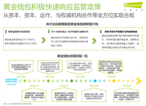 2018年5月,央行发布的《互联网黄金业务暂行管理办法》明确了“互联网黄金”的行业定义、准入条件和业务操作标准,对银行和互联网公司作出分工。借助这一政策,行业秩序得到维护,投资者利益也得到有力保障。监管要求发布后,黄金钱包迅速完成增资,实缴注册资本达3377.96万元,符合监管要求,并与平安银行达成战略合作协议,拟于互联网黄金领域联手开展多项业务。目前,双方合作方案已上报给央行,将在获批后推行实施。