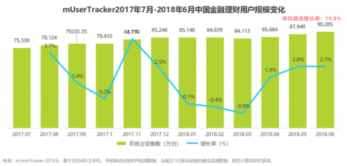 目前,随着移动互联网的高速普及,我国多数居民在共享出行、餐饮服务和金融理财等方面的生活习惯也纷纷迁移至移动端。根据艾瑞mUserTracker数据显示,2017年7月到2018年6月,中国金融理财用户规模整体呈现稳中有升的趋势,年均复合增长率为19.9%。