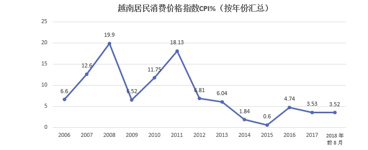 其一,随着石油、原材料、粮食食品、医疗服务、教育等一些基本必要品的价格所呈现的增长趋势,通胀压力也有所增加。2018年前8月,CPI平均指数同比增长3.52% 。尽管越南政府制定CPI保持在4%以下的目标,而目前该指标已得到控制,但其仍是值得关注的问题。越南政府的眼前首要任务是力争将2018年的CPI保持在4%以下。