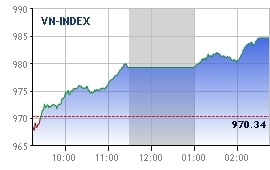 同时,油气板块今天继续保持强劲涨势。越南油气 (GAS) 上涨2.7%至10.35万越盾/股;PVS、PVD、POW、BSR等个股的涨幅分别为3.3%、2.7%、4.2%和4.8%。此外,大量资金也涌入其他板块,VIC、 NVL、 DXG、HDG、 C32等房地产股票、HPG、 VCS、CVT等建筑材料股票、VNM、 MWG、 MSN、PNJ等零售股均表现十分出色。TCM、HDG、HAG、QBS等股票纷纷站上涨停板块。相反,VHM、 TCB、TPB等大盘股今天逆势下滑,市场涨势因此不太理想。