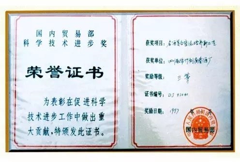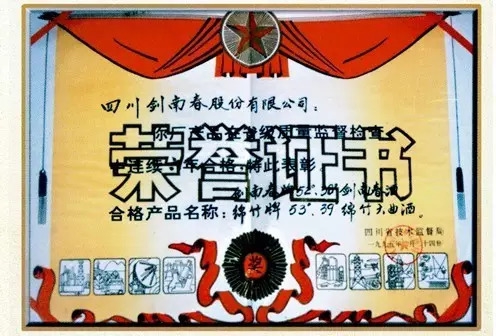 1995年38度、52度剑南春和39度、53度绵竹大曲获得四川省技术监督局颁发的省级质量监督检查连续六年合格表彰