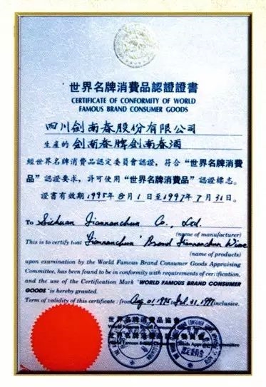 1995年的剑南春取得由世界名牌消费品协会颁发的“世界名牌消费品”认证标志使用权。