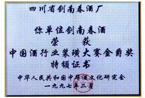1997年剑南春荣获中华酒文化研究会颁发的中国酒行业装潢大赛金爵奖