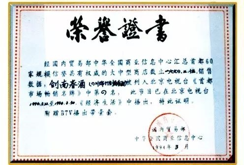 1994年剑南春酒被国内贸易部和中华全国商业信息中心评选为首都市场畅销名牌第四名。