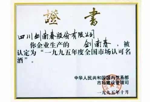1995年剑南春获国内贸易部和市场管理司颁发的“1995年度全国市场认可名酒”荣誉称号。
