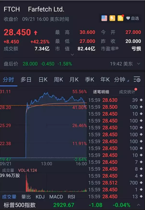 美国当地时间9月21日,英国奢侈品电商Farfetch美国纽交所挂牌上市,交易代码FTCH。该公司发行价20美元,交易首日竟以27美元开盘,盘中一度冲高至30.6美元,最终以28.45美元收盘,涨幅42.25%。9月24日收盘价为30.25美元,Farfetch市值达87.7亿美元,按照发行价20元计算,累计涨幅达到51.25%,按此计算,京东该项目投资回报超过3倍,而黄浦江资本该项目投资回报超过20倍。