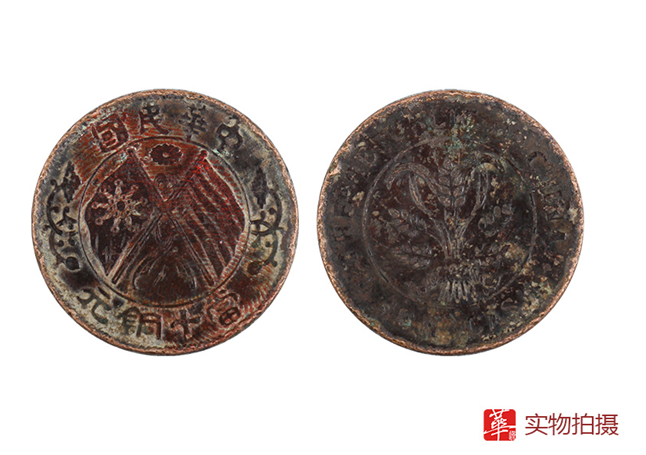 此枚中华民国双旗币当十铜元,正面面图案中央为两面交叉的国旗,上方为“中华民国”4字,下面为记值:当十铜元;藏品币正背面中心图案为稻穗组成的嘉禾纹,经过悠久的历史下依然保存完好,上面的锈迹也见证了其历史的沉淀,具有非常明显的历史过渡性特征,有着难以言喻的收藏价值。