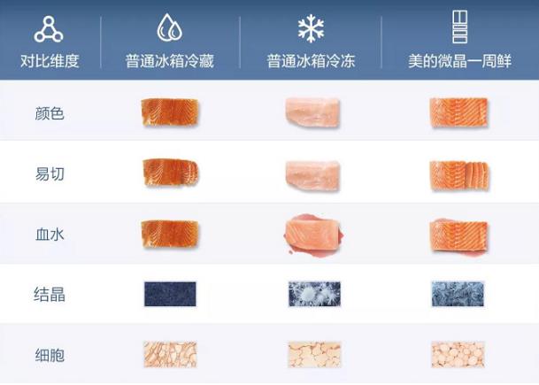 “保鲜”作为冰箱的基础功能,已从过往的“冰鲜”“保鲜”的基础保鲜要求升级到“持久保鲜”“健康保鲜”的高端保鲜需求。针对高端用户对肉类海鲜类等食材的细分保鲜需求,各大冰箱品牌如卡萨帝、西门子、海尔、美的、美菱等推出了真正解决用户痛点的创新保鲜技术,并不约而同地选择了“三文鱼”作为首批新鲜挑战对象,直面更严格的食材保鲜挑战。其中,冰箱领导品牌——美的冰箱“微晶一周鲜”科技以优异的技术表现,成功率先占领了智能保鲜市场。