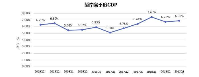 越南国内生产总值(GDP):2018年前9月,越南GDP同比增长6.98%(其中,第一季度增长7.45%;第二季度增长6.73%;第三季度增长6.88%),创自2011年以来历史新高。