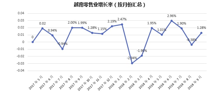 消费方面:今年前9个月服务贸易活动继续趋于良好增长势头,购买力增强。越南货物零售与消费服务总额预达3.235万亿越盾,同比增长11.3%;若排除增价因素仅增长8.8%(2017年同期其增长8.76%)。
