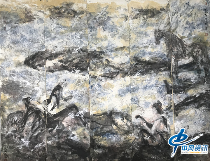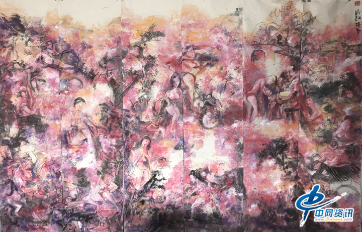 记者共欣赏到了“诗经风篇-郑风”、“诗经风篇-秦风”、“诗经风篇-王风”、“诗经雅篇-大雅”、“李白将进酒”、“苏东坡赤壁怀古”、“红楼梦”及“新红楼梦”等巨幅彩墨作品。通过这些作品,可以看到画家仲泊游努力吸纳着古代深厚的文化底蕴和坚守人类大真大美的精神家园,不事雕琢、纯任自然、放浪墨海、以传达其内心之迹象。
