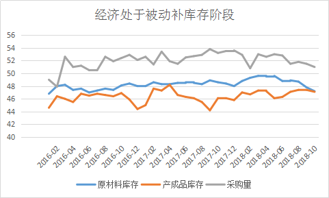 4.经济处于被动补库存阶段。10月产成品库存指数从47.4减小到47.1,原材料库存指数从47.8下降至47.2,采购量指数从51.5下降至51.0(如表3)。总需求放缓的背景下,企业主动减缓了采购原材料和生产扩张的速度。然而,其速度依旧不及总需求放缓的速度,导致企业被动的积累成品库存。