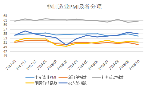 今日国家统计局公布,10月官方制造业和非制造业PMI分别为50.2和53.9,环比双双下降。其中,制造业连续27个月高于临界点,总体延续扩张态势,但创2016年以来新低。此外,综合PMI产出指数为53.1%,比上月回落1.0个百分点,表明我国企业生产经营活动延续扩张态势,但增速有所放缓。