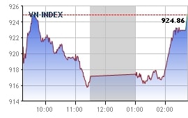VN30板块:该板块中有15只股票收涨,9只股票收跌。其中,午盘时,越南牛奶 (VNM) 和越南油气 (GAS) 的跌幅已被缩小,VNM下跌1.7%至11.65万越盾/股;GAS微跌0.4%至10.23万越盾/股。VIC、 CTG、 HPG等股票保持上周最后交易日的收盘价,SAB、 MSN、ROS、 VJC、 PLX等个股表现较佳。