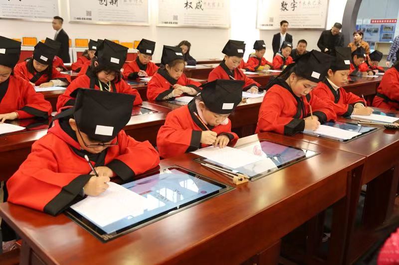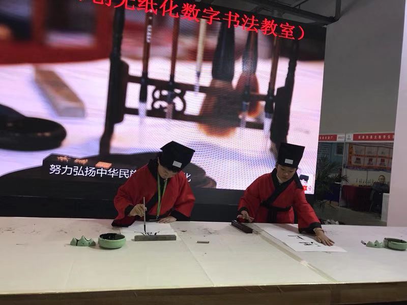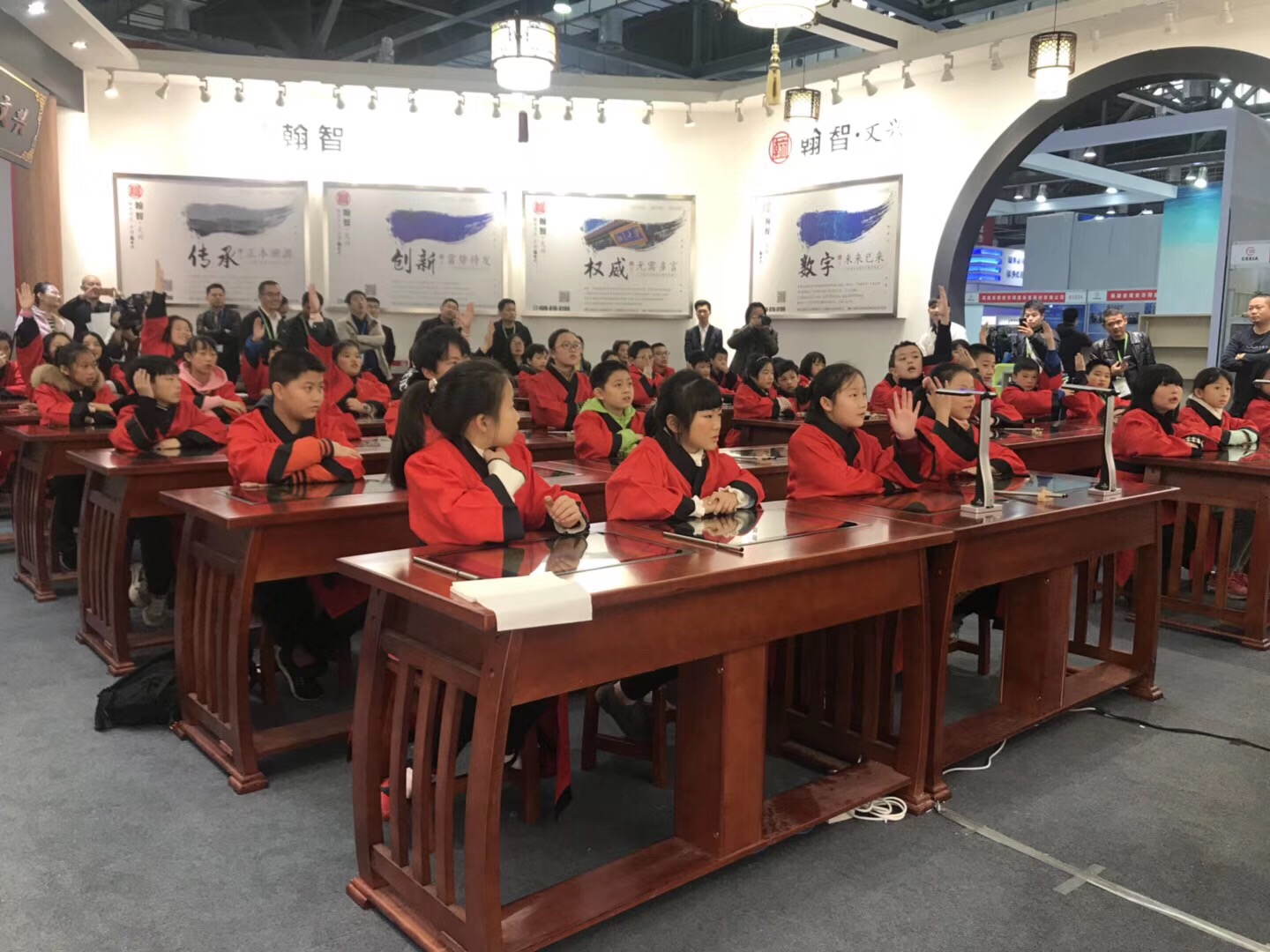 本次展会上“翰智智慧标准书法教室”更是一大亮点,一进入展厅,那48位儿童一身汉服在一间具有全智慧的现代装备,且充满浓郁中国风、翰智品牌韵味的书法教室内静心练字,令人耳目一新。翰智智慧标准书法教室内带有高科技含量的可调节显示亮度的数字化临摹台、智能笔洗系统、无蓝光教学一体机、国内外最先进的双目立体成像机、集约化教学管理软件、全室学生护眼照明成套系统,还有独一无二的写了就干13秒就风化的新型黑水亮相展厅,以及书法智慧体验台,构成国内智能化程度最高、理念最为先进、设计最为人性化的“智能化书法教室”,现场引来无数参观者驻足体验,真是络绎不绝、流连忘返。一位来自甘肃天水的小学校长长时间驻足教室,亲自体验与交流,并当场定购了两个教室。