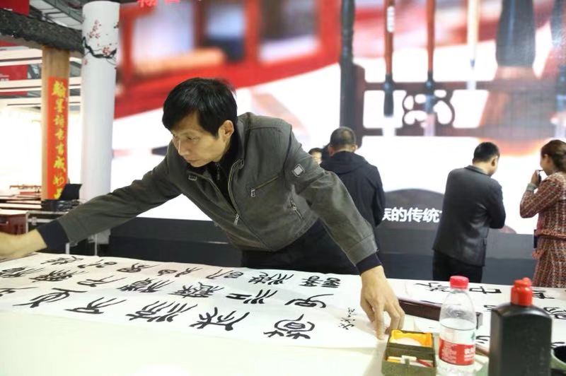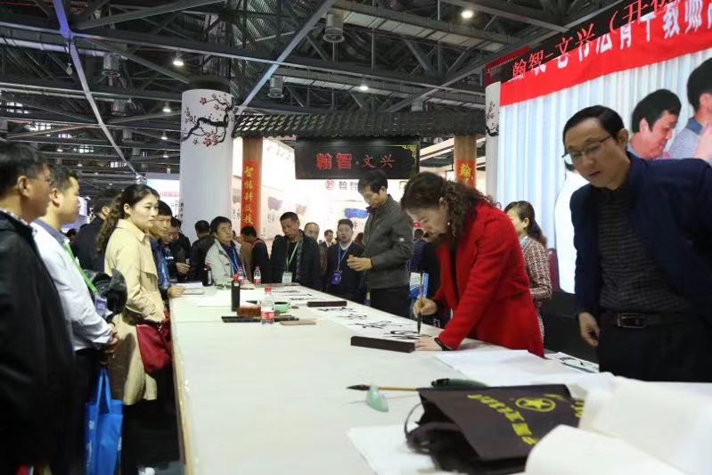 展区内,翰智牌专利智能毛笔,可自动储墨、免洗,方便携带,干净卫生引起参展者争相购买,国内首家扫码描红本系列教辅,1000多本样书,十几分钟被参观者争购一空。
