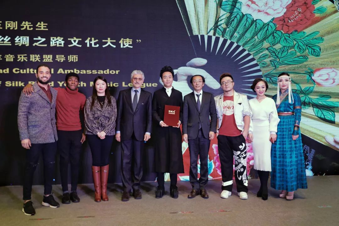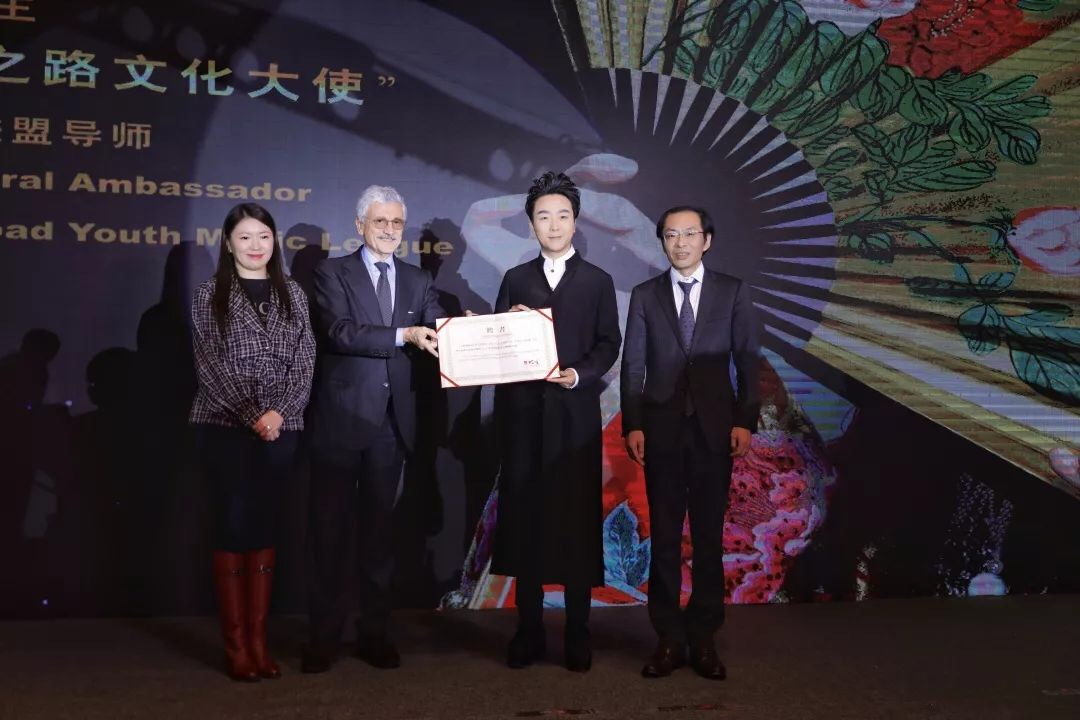 丝绸之路城市联盟副主席、北京戏曲评论学会会长靳飞邀请意大利前总理、丝绸之路城市联盟名誉主席马西莫•达莱马共同为著名青年艺术家李玉刚颁发“丝绸之路文化大使”和“丝路青年音乐联盟导师”证书。达莱马与李玉刚相拥祝贺时表示, “出任文化大使,实际上是一项很艰难的工作,因为您承担了文化联系人的重任,不仅要了解本国的文化,也要了解他国的文化,我相信您是最合适的人选,因为您代表了中国的传统文化,中国的文化源远流长,我很荣幸能为您颁发这项荣誉”。李玉刚回答说,“每一份荣誉都是一份使命,乐意为弘扬传播中华文化,推进丝路沿线国家之间的文化交流多做贡献。作为丝路青年音乐联盟导师,也非常期待与丝路青年们多交流,分享自己的经验,帮助联盟发展,促进丝路沿线的音乐交流”。