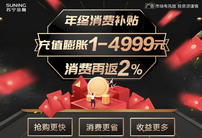 即日起至12月31日,用户登陆苏宁金融APP,点击首页“零钱宝”可看到“年终消费补贴”的悬浮页,点击“立即参加”即可参与充值零钱宝消费金满100元随机膨胀1-4999元活动,活动期间每人可参加3次。消费金享受零钱宝收益,可在苏宁易购消费,60天后可提现,让你获益更多。