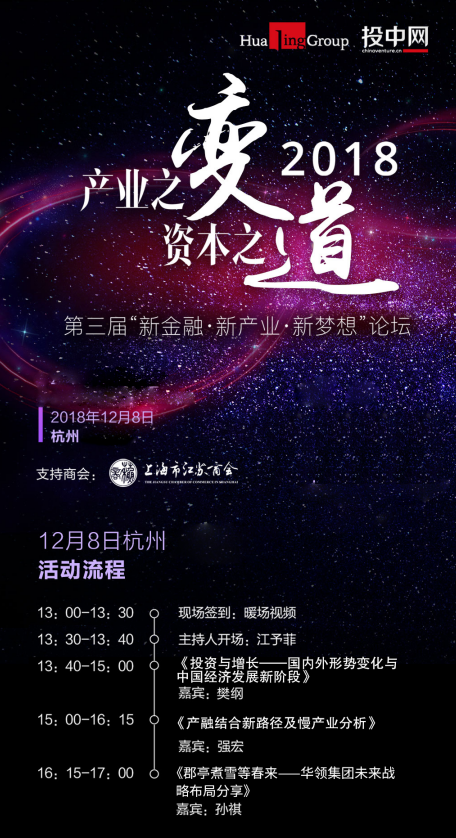 2018年12月8日,华领集团将于杭州柏悦酒店召开第三届“新金融、新产业、新梦想:资本之变,产业之道”高峰论坛·杭州站,届时将与国民经济研究所所长樊纲、商务部中国国际经济合作协会副秘书长强宏等诸多专家学者一同探索如何过思维的火花了解产业革命的力量,一起了解财富咨询行业服务的本质,一起翻山而歌,期待民营企业新一轮春天的到来。