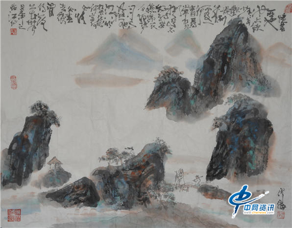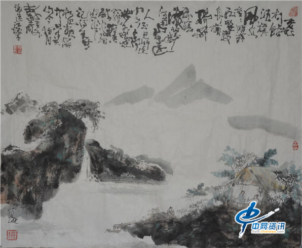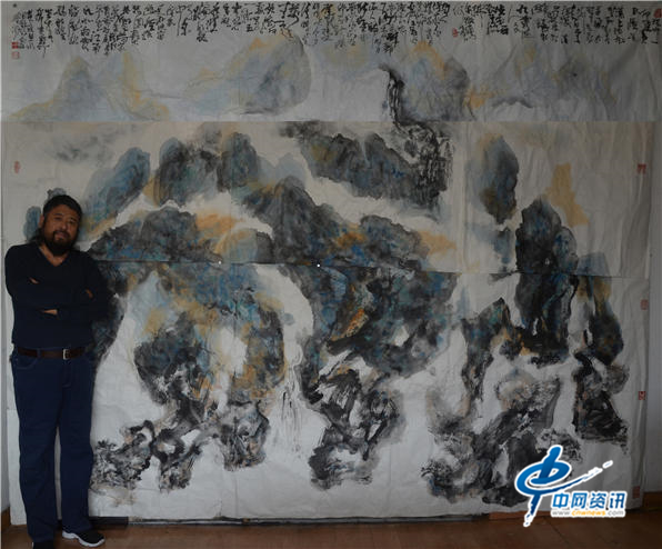 画家仲泊游与其作品宋黄庭坚山水示意图(400CM*300CM)
